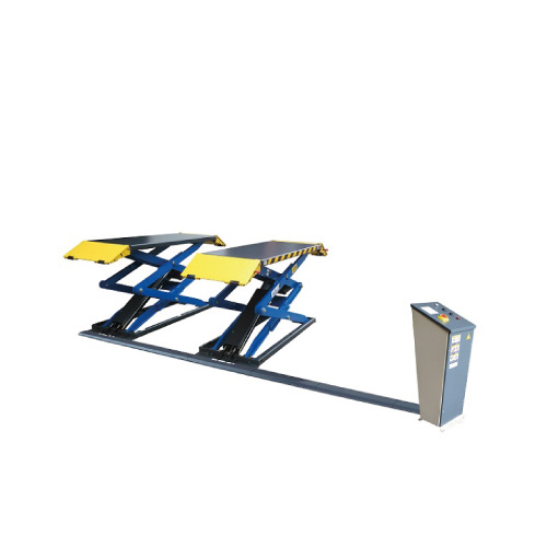 Elevador de tijeras a nivel superficie de 3 toneladas, con interruptor de parada CE a 300mm del suelo y tono de alarma al bajar a 300mm al suelo.